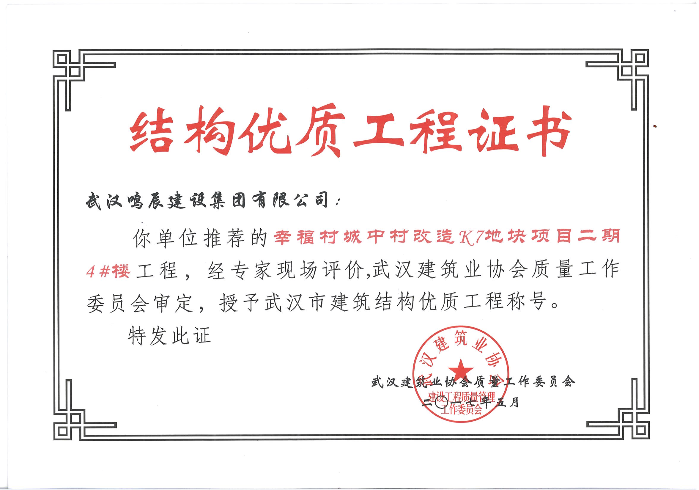 幸福村城中村改造K7地塊項目二期4#樓榮獲武漢市結(jié)構(gòu)優(yōu)質(zhì)榮譽(yù)