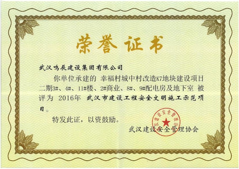 幸福村城中村改造K7地塊建設(shè)項目二期1#、4#、11#樓、2#商業(yè)、8#、9#配電房及地下室被評為2016年度武漢建設(shè)工程安全文明施工示范項目