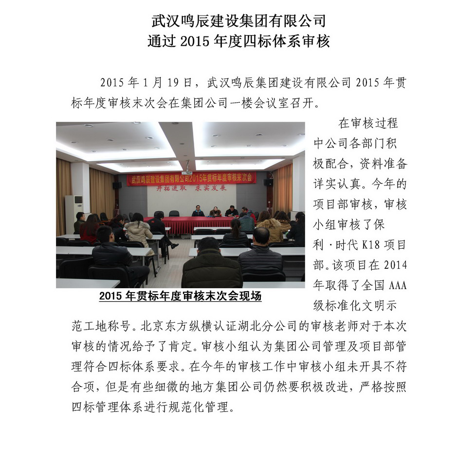 武漢鳴辰建設集團有限公司通過2015年度四標體系審核