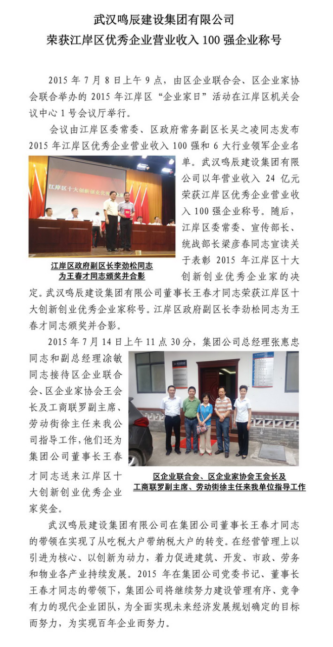 武漢鳴辰建設(shè)集團(tuán)有限公司榮獲江岸區(qū)優(yōu)秀企業(yè)營(yíng)業(yè)收入100強(qiáng)企業(yè)稱號(hào)